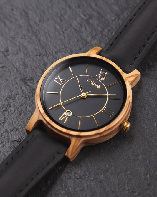 Holzarmbanduhr Rosenbach schwarz - Olivenholz